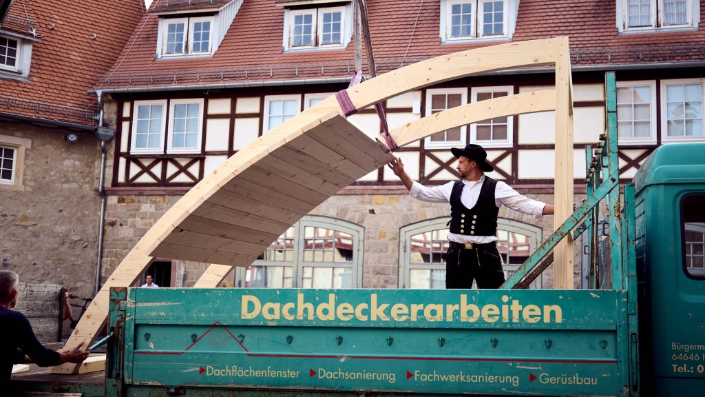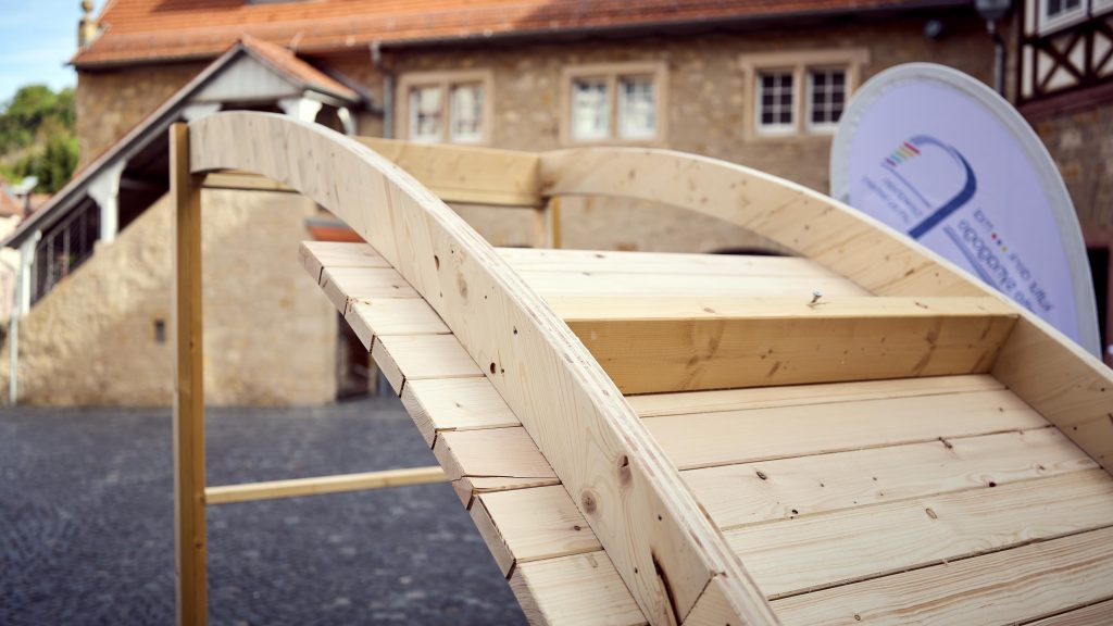 Im Innenhof präsentierten wir ein beeindruckendes 1:1-Modell eines Teilausschnitts des historischen Tonnengewölbes für den Betsaal, gefertigt von der Firma Holzbau Vock; ein Zimmermann stellte die Holzkonstruktion und unser Spendenkonzept vor, nach dem jede Bohle symbolisch übernommen werden kann, mit individueller Namensgravur, fotografischer Dokumentation, einer Urkunde mit Foto sowie einer namentlichen Veröffentlichung im fertiggestellten Gebäude. Zusätzlich können Patenschaften für weitere Bauteile wie Fensterläden, Treppenstufen oder Möbel übernommen werden.